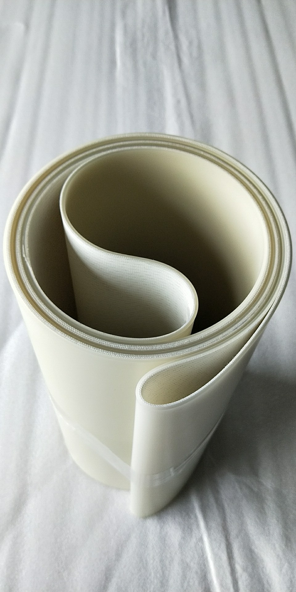 PU白色食品輸送帶(裙邊擋板帶),擋邊起防止物料測滑撒落的作用。為便于轉彎,裙邊設計成波紋狀;橫隔板的作用是承托物料,為了實現大傾角輸送,采用T型TC型。檔邊和橫隔板是用二次硫化的方法與基帶連接的,具有很高的連接強度。用于輸送易散落的粉狀、粒狀、小塊狀、糊狀及液態狀物料。